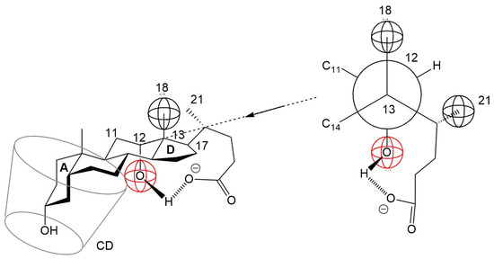 Anions of non-conjugated bile acids, such as cholic acid and deoxycholic acid, are known to form an intramolecular hydrogen bond between the C24 carboxylate group and the C12 α-axial hydroxyl group in both aqueous solution and crystalline states [38]. This intramolecular interaction may increase the steric volume of the D ring, potentially hindering its inclusion into the hydrophobic cavity of β-cyclodextrin (βCD). Consequently, it is plausible that the A ring of the steroid nucleus preferentially enters the βCD cavity, leading to the formation of a 1:1 inclusion complex (Figure 9). This proposed orientation aligns with observations from NMR studies on similar steroidal compounds, where the A ring was found to enter the βCD cavity from the narrow rim, while the D ring remained near the wider rim [39].