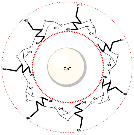 Cs+ ions, due to their low surface charge density and weak hydration, have been described as “hydrophobic cations,” and may interact with hydrophobic cavities such as that of β-cyclodextrin (Figure 12). It is therefore plausible that Cs+ ions partially occupy the βCD cavity, leading to competition with bile salt anions (specifically the A ring of the steroid skeleton) for inclusion. Such competition could explain the observed decrease in the equilibrium constant for complex formation in βCD solutions containing 400 mM CsCl, compared to βCD solutions without added Cs+. Although direct evidence for Cs+ inclusion is not available in this system, similar effects have been proposed in related host–guest studies involving large alkali metal cations [59].