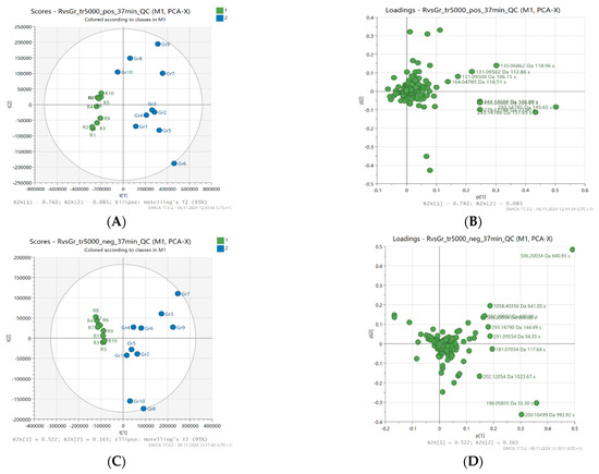 Principal component analysis (PCA) was used to assess the distribution of samples and the contribution of variables to the creation of principal components. PCA scores (A and C) and PCA loadings (B and D) of the best results, a 37-min gradient, and a threshold of 5000 were used, and are presented in Figure 1.