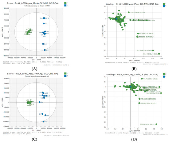 Figure 2 shows the OPLS-DA scores and loading plots, enabling a better understanding of the structure and variability of the data. In the score plot (A and C) for the predictive component (t [1]), a clear separation is noticeable between two groups of samples—active (blue) and less active (green). The t [1] component accounts for 63.2% of the variability in the positive ionization data (R2X [1] = 0.632) and 44.3% of the variability in the negative ionization data (R2X [1] = 0.443), indicating that the model effectively separates both groups based on this principal component.
