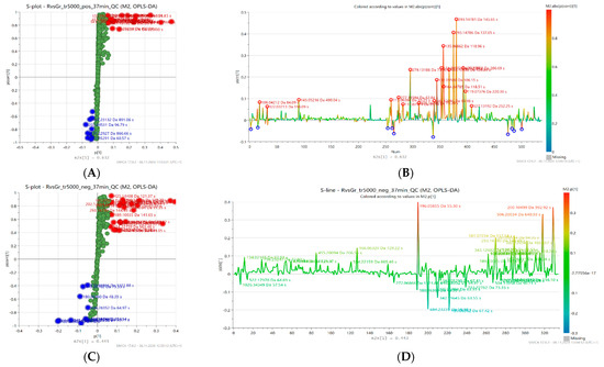 To explore the relationship between metabolites and antioxidant activity levels, visualization of variables (retention time and exact mass pairs) was used by creating an S-line and an S-plot, shown in the Figure 3. The S-line plot (B and D) enabled the evaluation of the effect of individual variables on sample separation in the model space, while the S-plot (A and C) analysis allowed for the identification of metabolites that were particularly associated with high antioxidant activity. In the S-plot, variables (metabolites) correlating with high antioxidant activity (characterized by high magnitude (modeled co-variation) and high reliability (modeled correlation)) are highlighted in the upper right corner (red color), while those associated with low activity are in the lower left corner (blue color).
