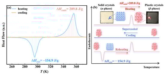 The commercially obtained AMPD exists as a white crystalline solid (α-phase) at room temperature. Thermal pretreatment at 360 K induced its transformation into a colorless plastic crystalline state (β-phase), enabling the subsequent phase transition process [16]. A sealed aluminum crucible containing 11.42 mg of AMPD was subjected to DSC analysis under controlled cooling and heating rates of 2 K/min. As shown by the yellow curve in Figure 1a, no discernible exothermic crystallization peak was observed during cooling from 360 to 250 K, confirming AMPD retained a supercooled state without spontaneous nucleation. The exceptional supercooling stability originates from its three-dimensional hydrogen-bonding network, formed through synergistic interactions between the hydroxyl (-OH) and amino (-NH2) groups, which effectively suppresses molecular rearrangement and crystalline nucleation [17,18]. During the subsequent heating process (blue curve, Figure 1a), AMPD exhibited two distinct phase transitions. The first was an exothermic peak at 290 K (ΔHexo = −154.9 J/g), corresponding to the crystallization of the supercooled β-phase into the low-temperature α-phase. The second was an endothermic peak at 360 K (ΔHendo = 209.8 J/g), indicating the phase transition from α- to β-phase, where AMPD reverts from the crystalline solid to the plastic crystalline state. The structural features and transition pathway are further illustrated in Figure 1b, which provides a visual summary of the reversible phase evolution between the α-phase, β-phase, and the metastable supercooled state. This phase behavior highlights the dynamic stabilization of both the crystalline and plastic crystal states by the hydrogen-bonding network during thermal energy storage and release [8].