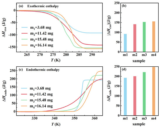 Enthalpy changes during the phase transition of AMPD with varying sample masses. (a) Enthalpy changes curves as a function of temperature during the reheating process. (b) Variations in exothermic enthalpy change (absolute value) for samples of different masses. (c) Enthalpy changes curves as a function of temperature during the heating process. (d) Variations in endothermic enthalpy change for samples of different masses.