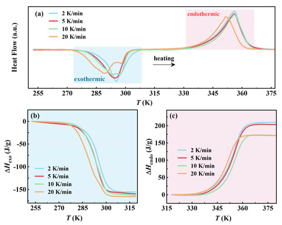 The effect of different cooling rates on the phase transition of AMPD: (a) Heat flow curves during heating at a fixed rate of 5 K/min after cooling at different rates, and (b,c) the variations in exothermic and endothermic enthalpy with temperature during the heating process, respectively.