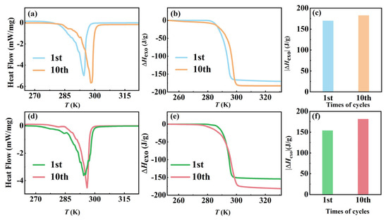 The effect of cooling rates on the exothermic phase transition of AMPD during thermal cycling. (a) Heat flow curves and (b) enthalpy changes as functions of temperature for a cooling rate of 2 K/min, and (c) comparison of the absolute enthalpy changes after ten thermal cycles at 2 K/min. (d) Heat flow curves and (e) enthalpy changes as functions of temperature for a cooling rate of 10 K/min, and (f) comparison of the absolute enthalpy changes after ten thermal cycles at 10 K/min.