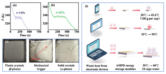 The temperature evolution of AMPD samples during cooling and mechanical triggering. (a) m1 = 1125 mg and (b) m2 = 2250 mg. (c) Supercooled plastic crystalline state. (d) Phase transition upon triggering at 333.16 K (~60 °C). (e) Solid crystalline state after phase transition. (f) The application of AMPD in electronic devices (mobile phones, tablets, and laptops) for waste heat recovery, and its secondary utilization for water heating.