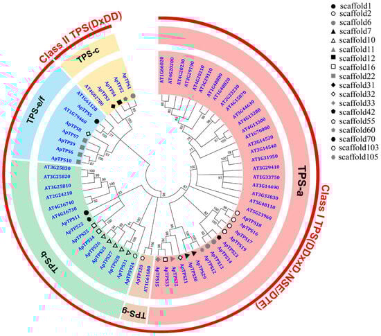 Seven ApTPSs groups (e.g., group 1: TPS6, 7, 9, 10; group 2: TPS16, 17, 18, 19; group 3: TPS13, 14; group 4: TPS29, 30; group 5: TPS20, 24; group 6: TPS25, 26, 27, 28, 31; group 7: TPS34, 35) were found through the analysis results of scaffold classification, which also contained the similar intron–exon structure and the conserved motifs (Figure S1), and the same groups’ ApTPSs (except group 5) were clustered in the same branch. These results reveal that these ApTPSs have a relatively close evolutionary relationship and similar catalytic activities.