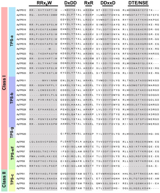 By performing a phylogenetic analysis of ApTPSs, we found that ApTPS1, ApTPS2, ApTPS3 and ApTPS4 clustered with the characterized protein (AtCPS; AT4G02780) within the TPS-c subfamily belonging to class II diTPS (Figure 1), and contained the conserved motifs DxDD (Figure 2). The biological function of the two ApTPSs (ApTPS1 and ApTPS2) has been characterized; they convert GGPP to ent-CPP and were named ApCPS1 and ApCPS2 [19,25], and ApTPS3 is similar to ApCPS3 [19,20,25] according to BLAST results, but the ApTPS4 enzymes of four class II TPS members have not been reported. And ApTPS5 to ApTPS35 were characterized as class I TPSs (Figure 1), which contained conserved DDxxD (or NDxxD) and clustered with the class I TPSs of Arabidopsis thaliana. Six of thirty-one class I TPSs clustered with the characterized AtKS genes within the TPS-e/f subfamily, which were characterized as encoding ent-kaurene synthase, and the members of this subfamily gene were also named class I diTPSs. Fourteen or ten of thirty-one class I TPSs clustered with the members of the TPS-a or TPS-b subfamilies of A. thaliana.