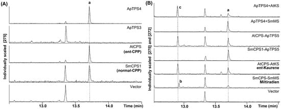 Putative class II diTPSs were expressed in BY-T20 to characterize their biological function. The hydrolysate was detected by GC-MS (Thermo Fisher Scientific, Waltham, MA, USA) analysis. The production of CPP was detected for ApTPS4 by comparison with the known activity of AtCPS (AT4G02780) [26] and SmCPS1 (AWM30276.1) (Figure 3A), and no new products were detected for ApTPS3. ApTPS4 was coupled with stereospecific class I diTPSs, miltiradiene synthase from Salvia miltiorrhiza (SmMS, ABV08817) [27] or kaurene synthase from A. thaliana (AtKS, AAC39443) [28], which respectively and specifically use CPP or ent-CPP. In this strain, the two class I diterpene synthases both produced ent-kaurene in assays of ApTPS4 and AtCPS coupled with AtKS, while miltiradiene was observed only in strain SmCPS1 coupled with SmMS. Thus, ApTPS4 was characterized as an ent-copalyl diphosphate synthase (Figure 3).
