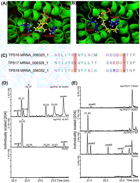 Key residues and site-directed mutants of ApTPS. (A) Docking of FPP in the active site of ApTPS16. (B) Docking of FPP in the active site of ApTPS17. (C) Conservation of select target residues in ApTPS16/17/18, as discussed in the text. (D) GC-MS analysis of extracted fermentation products of ApTP16 and their mutants (in BY-T15). (E) GC-MS analysis of extracted fermentation products of ApTP17 and their mutants (in BY-T15) (* peak of the main products; the ApTPS16 or ApTPS17 model is shown in green colour, the FPP ligand is shown as yellow sticks, and the target amino acids are shown as blue sticks).