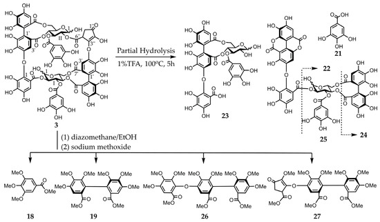 Eurobustin C (3) was obtained as a pale-brown amorphous powder. The molecular formula of this material (C67H48O43) was determined by HR-ESI-MS from its singly and doubly charged molecular ions with m/z 1539.1491 [M − H]− and 769.0657 [M − 2H]2−, indicating that compound 3 was an ellagitannin dimer. Some of the aromatic and sugar proton signals in the obtained 1H-NMR spectrum was broadened probably because of the poor flexibility of the macro-ring arising from restricted rotation. The 1H-NMR spectrum of compound 3 exhibited two 2H singlets at δ 7.15 and 7.08 attributable to the protons of one galloyl group. Three 1H singlets at δ 7.18, 6.85, and 6.56, and two 1H singlets at δ 6.39 and 6.26 indicated the presence of an HHDP group and a new acyl unit named a eurobustinoyl group. This unit is metabolized by the dehydrovaloneoyl group of eugeniflorin D2 (14). Therefore, the 1H-NMR spectrum of compound 3 is similar to that of compound 14. 1H-1H correlation spectroscopy (COSY) experiment revealed the presence of two 4C1 conformation glucopyranose cores. The doublet at δ 6.94 (J = 3.6 Hz) and δ 4.84 (J = 8.8 Hz) of anomeric protons resonated at a higher field than those expected for the C-1 signals of acylated α- and β-anomers, demonstrating that both anomeric centers were unacylated. A methine proton signal at δ 4.45 and methylene proton signals at δ 2.14 and 1.89 were coupled to each other. The 13C-NMR spectrum of compound 3 showed the presence of an α, β-unsaturated ketone system (δ 136.9, 160.6, and 197.2). Heteronuclear multiple bond connectivity (HMBC) experiment revealed the existence of correlations between methyl protons and carbonyl carbon (δ 197.2), which were separated by two bonds. The 13C-NMR spectrum was similar to those of brevifolincarboxylic acid [19]. Therefore, this compound contains a five-membered ring according to the HMBC experiment of compound 3. The connectivity between a methine protons (δ 4.45) and one of the methylene protons (δ 2.14), and H-2 of glucose II (δ 4.82, t, J = 8.8 Hz) was confirmed by a long-range correlation through the same ester carbonyl carbon signal (δ 170.5). Similarly, H-3’ of the valoneoyl group (δ 6.85) correlated with H-4 of glucose II (δ 4.82, t, J = 8.8 Hz) through the signal at δ 166.9. The allocations of galloyl groups at O-3 of glucose I and O-3 of glucose II were also established by the cross peaks of H-3 of glucose I (δ 5.42, t, J = 8.8 Hz) and H-3 of glucose II (δ 5.92, t, J = 6.8 Hz), respectively, formed with the ester carbonyl carbon at δ 168.2 and 166.2, which correlated with the galloyl proton signals (Figure S4). These data suggested the formation of structure 3, which was supported by the following chemical reaction. The partial hydrolysis of compound 3 in hot water containing 1% trifluoroacetic acid (TFA) produced gallic acid (21), valoneic acid dilactone (22), oenothein C (23) [24], isocoriariin F (24) [25,26], and cornusiin B (25) [26,27]. The valoneoyl group of compound 3 was of the isorugosin type because this reaction yielded compounds 23–25. The methylation of compound 3 with dimethyl sulfate and potassium carbonate in acetone followed by methanolysis resulted in compounds 18 and 19, trimethyl octa-O-methylvalonate (26), and trimethyl hexa-O-methyleurobustinate (27). Compound 19 was produced by the cleavage of the ether bond of the valoneoyl group (Figure 4). The S-configuration was identified for both the valoneoyl and eurobustinoyl group in compound 3 by the positive cotton effects in the CD spectrum [22]. Finally, the structure of compound 3 was established based on these data.