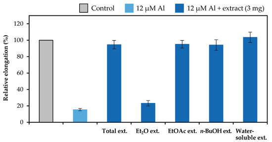 Al detoxification properties of the extracts in the liquid–liquid distributions. Roots of A. thaliana were exposed to 500 mL of a 2% strength modified Molecular Genetics Research Laboratory (MGRL) medium (pH 5.0) containing 0 or 12 μM AlCl3 and 3 mg of the extracts for 24 h. The relative root elongation is expressed as the percentage of the root elongation in the control sample (0 μM Al without extract). The values and error bars are expressed as means ± SE (n = 20).