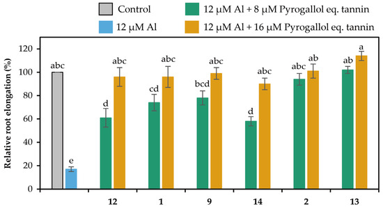 Al detoxification properties of ellagitannins (compounds 1, 2, 9, 12, 13 and 14) isolated from E. camaldulensis. Roots of A. thaliana were exposed to a 2% strength modified MGRL medium (pH 5.0) containing 0 or 12 μM AlCl3 and 0, 8, or 16 μM pyrogallol-equivalent ellagitannin for 24 h. The relative root elongation is expressed as the percentage of the root elongation in the control sample (0 μM Al, 0 μM ellagitannin). The values and error bars are expressed as means ± SE (n = 20). The bars marked with the same letter do not differ significantly at p < 0.05 (Tukey-Kramer test).