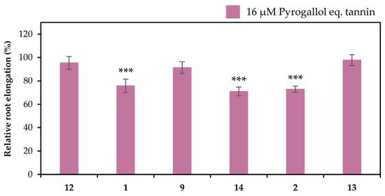 Effects of ellagitannins (compounds 1, 2, 9, 12, 13 and 14) on the root elongation. Roots of A. thaliana were exposed to 0 or 16 μM pyrogallol-equivalent ellagitannin in a 2% strength modified MGRL medium (pH 5.0) for 24 h. The relative root elongation is expressed as the percentage of the root elongation in the control sample (0 μM ellagitannin). The values and error bars are expressed as means ± SE (n = 20). The asterisks indicate a significant difference compared with the control at p < 0.001 (Student’s t-test).