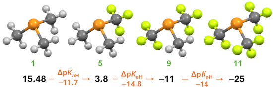As shown in references [26,47], alkyl-substituted phosphanes generally exhibit higher basicity compared to aromatic phosphanes, with the exception of aromatic phosphanes that contain predominantly methoxy-substituted aromatic rings. This is attributed to the negative field-inductive effect of the phenyl ring, which destabilizes the protonated form of the phosphane, as previously discussed. Similarly, fluorination of the alkyl groups has a decreasing effect on phosphane basicity due to the strong electron-withdrawing nature of fluorine. Replacing a methyl group with a trifluoromethyl group in PMe3 reduces its basicity by approximately 11–15 pKaH units per methyl group, as illustrated in Figure 1. This substantial change highlights the distinctive properties of fluorine that result from its exceptionally high electronegativity.