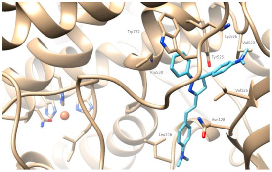 Based on previous findings in this present study, compounds were evaluated for the mode of binding to both the active site as well as the whole enzyme with the aim of performing a comprehensive study of all possible allosteric centers. It appears that the compounds besides binding in an allosteric manner show similarities in terms of the binding mode. Probably due to stereochemical hindrances they are not allowed to enter the active site of the enzyme, which is confirmed by earlier studies. On the basis of the above results, it is concluded that the compounds act allosterically thereby blocking the enzyme activity. The most active compound 2e presents a binding score of −9.7 kcal/mol and develops hydrophobic interactions with the amino acids Val126, Asn128, Leu246, Val520, Tyr525, Lys526, Pro530 and Trp772. Figure 3 shows the optimal binding mode of compound 2e to the enzyme lipoxygenase from soybean (PDB ID: 3PZW). The iron of the active site is shown as an orange sphere. Moreover, Figure 4 describes the ligand interaction diagram of compound 2e with soybean lipoxygenase (ID: 3PZW).