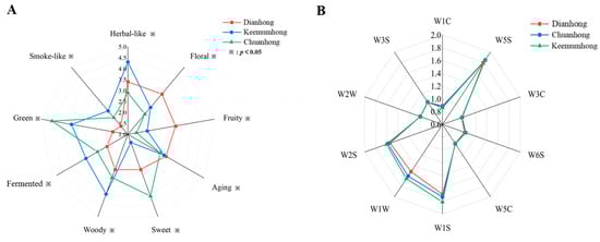 Aroma profile of Keemumhong, Chuanhong, and Dianhong (A). Electronic nose radar diagram of Dianhong, Chuanhong, and Keemumhong (W1C, mainly sensitive to aromatic components and benzene compounds; W5S, mainly sensitive to nitrous oxides; W3C, mainly sensitive to ammonia and aromatic components; W6S, mainly sensitive to hydrocarbons; W5C mainly sensitive to alkane, aromatics, and small polar compounds; W1S, broad range—methane; W1W, mainly sensitive to inorganic sulfides; W2S, mainly sensitive to most alcohols, aldehydes, and ketones; W2W, mainly sensitive to aromatics and organic sulfides; W3S, mainly sensitive to long-chain alkanes) (B).