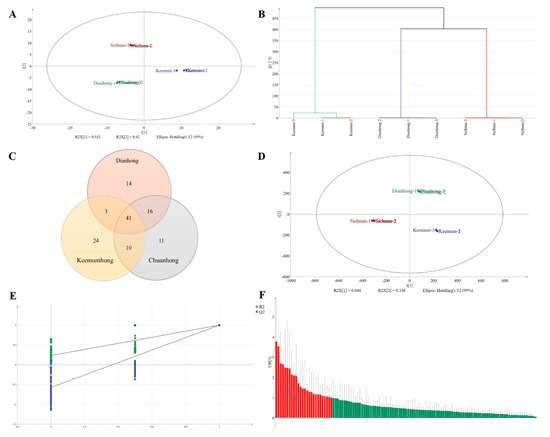 PCA of volatile compounds in Dianhong, Chuanhong, and Keemumhong (A). HCA of volatile compounds in Dianhong, Chuanhong, and Keemumhong (B). Venn diagram of volatile compounds in Dianhong, Chuanhong, and Keemumhong (C). PLS-DA scores for volatile compounds of Dianhong, Chuanhong, and Keemumhong (D). PLS-DA permutation test for volatile compounds of Dianhong, Chuanhong, and Keemumhong (E). PLS-DA VIP scores for volatile compounds of Dianhong, Chuanhong, and Keemumhong (F).