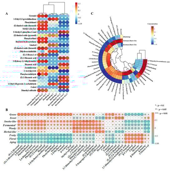 The heat map of key identifying compounds in Dianhong, Chuanhong, and Keemumhong (A). Pearson’s correlation analysis of 41 odor compounds and flavor profiles with OAV > 1 (B). Comparison of quantitative compound contents in Dianhong, Chuanhong, and Keemumhong (C).