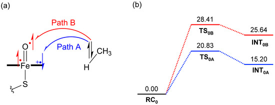 We began by performing DFT calculations on the H-abstraction step shown in Scheme 1b, using a simplified model system without OEEFs. In this model, a porphine ring and a hydrosulfide anion (HS−) were used to represent the equatorial and proximal ligands, respectively. Methane (CH4) was chosen as the model alkane substrate due to its structural simplicity. Methane has also been employed in several previous computational studies on P450 Cpd I reactivity [49,50,51]. The geometries of the stationary points along the reaction pathway (RC, TS, and INT) were optimized using the above-described model and are denoted as RC0, TS0A/TS0B, and INT0A/INT0B. The subscripts A and B indicate two distinct electronic pathways, referred to as Paths A and B, which are described in detail below.