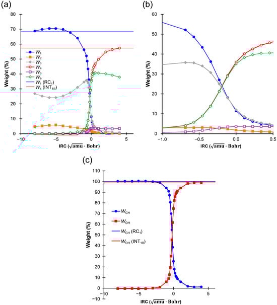 (a) Weights (in %) of Φ1–Φ6, plotted against the IRC. The blue and red horizontal lines represent the weight of Φ1 for RC1 and that of Φ4 for INT1B, respectively. (b) Enlarged view of the graph near the TS region. (c) Evolution of WCH and WOH along the IRC. The blue and red horizontal lines represent WCH at RC1 and WOH at INT1B, respectively.