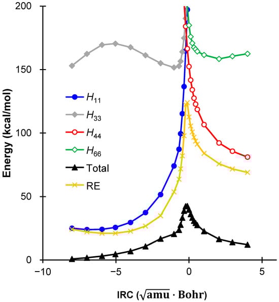 Total energy, diagonal Hamiltonian matrix elements (including nuclear repulsion), and resonance energy (in kcal/mol) plotted along the IRC and reported relative to the total energy of RC1.