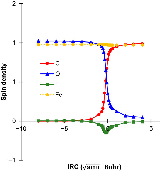 We next examined the evolution of spin densities along the IRC, as shown in Figure 5. On the reactant side of the coordinate, both Fe and O carried spin density values of approximately +1.0, while the abstracted hydrogen atom and the carbon atom exhibited negligible spin. This aligns well with the depiction in Figure 1a, where Fe and O maintain radical character, but the substrate remains largely unaffected. This spin distribution persisted up to the vicinity of the TS. Upon crossing the saddle point, dramatic shifts in spin densities were observed. The spin density on the oxygen atom decreased significantly, while that on the carbon atom rapidly increased (Figure 5), effectively reversing their spin populations. The decrease in spin density on the oxygen atom reflects the reduction of its initial radical character as the iron(IV)–oxo unit transitions into an iron(III)–hydroxide species. Simultaneously, the substrate is transformed into a methyl radical, thereby resulting in the emergence of substantial spin density on the carbon atom. During this transition, the C–H bond is cleaved, and a new O–H bond is formed. Additionally, near the saddle point, the spin density on the hydrogen fragment became slightly negative but quickly returned to zero. This indicates that the hydrogen atom does not develop strong radical character during the reaction. Throughout the process, the spin density on Fe remained stable at approximately +1.0, without notable fluctuation, supporting the notion that the unpaired electron on Fe (Scheme 3) does not actively participate in the reaction mechanism.