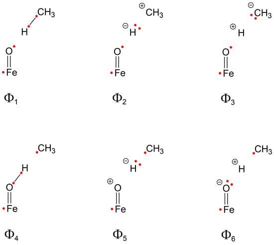 Although accurately describing the wave function for even this simple model requires a large number of VB structures, the primary objective of this study is to obtain a qualitative, first-step understanding of electronic factors governing the H-abstraction process while minimizing computational cost. In line with this goal, we selected a representative subset of VB structures, denoted as Φ1–Φ6, for inclusion in our VB calculations (Scheme 3). These structures were chosen to capture the essential bonding patterns and electron reorganization associated with the H-abstraction step. Additional details regarding the selection of VB structures are provided in the Section 3.