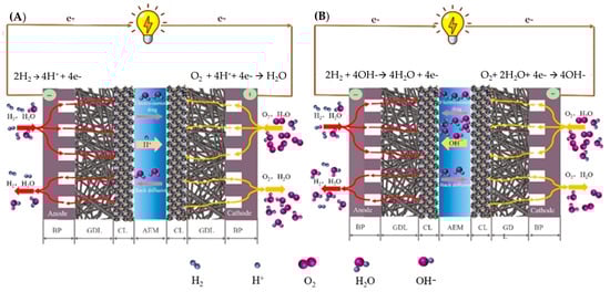 Among fuel cells, polymer electrolyte membrane fuel cells specifically operating at low temperature (below 120 °C) convert the energy of a fuel such as hydrogen or methanol into electricity with low or zero emissions and high efficiency. They can be classified in terms of the electrolyte in the cell [12] into Proton Exchange Membrane Fuel Cell (PEMFC) (Figure 1A) or Anionic Exchange Membrane Fuel Cell (AEMFC) (Figure 1B). In acidic electrolytes, proton transfer from the anode to the cathode is promoted, while in alkaline electrolytes, hydroxyl ion is transferred from the cathode to the anode, so that the type of components, such as the catalyst layers and the membrane, may differ depending on the electrolyte.