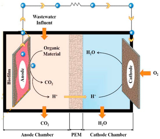 A special type of polymer electrolyte membrane fuel cell, very attractive for its environmental applications, is the microbial fuel cell (MFC), which converts the chemical energy of organic matter such as carbohydrates and organic acids into electricity directly using microorganisms. The wastewater is used as fuel for producing electrical power (Figure 2) [14].