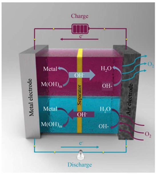 Schematic operating process of aqueous metal–air batteries from [16]. © 2019 Elsevier B.V. (2019).