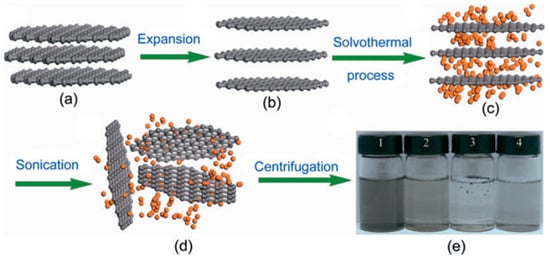Schematic illustration of solvothermal-assisted exfoliation and dispersion of graphene sheets in acetonitrile: (a) pristine expandable graphite; (b) ExG obtained by heating at 1000 °C under an atmosphere of forming gas (5% H2 and 95% Ar); (c) insertion of acetonitrile molecules into the interlayers of ExG; (d) exfoliated graphene sheets dispersed in acetonitrile; (e) optical images of four samples obtained under different processes and centrifugation conditions [22].