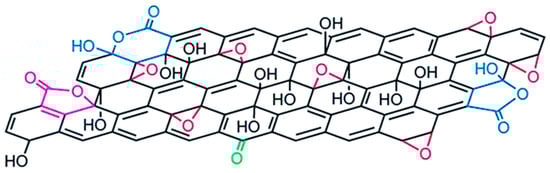 In addition to physical methods, exfoliation of graphite can also be realized chemically to produce graphene oxide [65] characterized by various oxygen moieties (Figure 6), which in turn can be chemically converted to reduced graphene oxide (rGO), with restoration (albeit partially) of the sp2 carbon configuration in the graphene state.