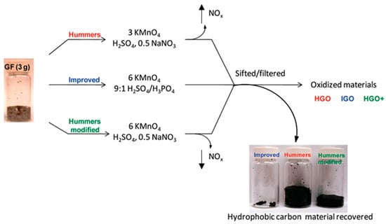 Representation of the procedures followed, starting with graphite flakes. Images of the oxidized hydrophobic carbon material collected during purification using IGO, HGO, and HGO+ (in the glass bottles) are presented. Reprinted with permission from [69]. Copyright {2010} American Chemical Society.