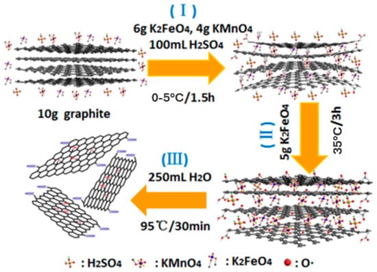 Besides the use of a greater amount of KMnO4 instead of NaNO3 [71,72], further modification of Hummers’ method was accomplished by introducing a pre-oxidation step before KMnO4 oxidation (in the absence of NaNO3) [73] or by replacing KMnO4 with K2FeO4 while NaNO3 was removed [74,75]. Yu et al. [76] addressed the problems of high consumption of oxidants, intercalating agents, and time-consuming procedure by partly replacing KMnO4 with K2FeO4 and using a smaller amount of concentrated sulfuric acid, according to the scheme in Figure 8, offering new possibility for the production of GO in an economical, eco-friendly, and efficient way.