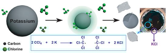 Since large-scale exfoliation is needed, more effective techniques were developed, including liquid exfoliation based on the use of organic solvents like N-methyl-pyrrolidone (NMP) and dimethylformamide (DMF): in this way, the energy required to exfoliate graphene could be balanced by the solvent–graphene interaction for solvents whose surface energies match that of graphene [21]. It was also observed that further improvement of the yield was obtained if exfoliation of graphite in polar solvents is assisted by other processes, such as a solvothermal process. Qian et al. [22] readily produced monolayer and bilayer graphene by solvothermal-assisted exfoliation and dispersion in acetonitrile (Figure 4), followed by centrifugation in 10–12 wt% yield by using expanded graphite (ExG) as the starting material.