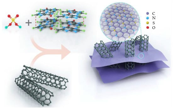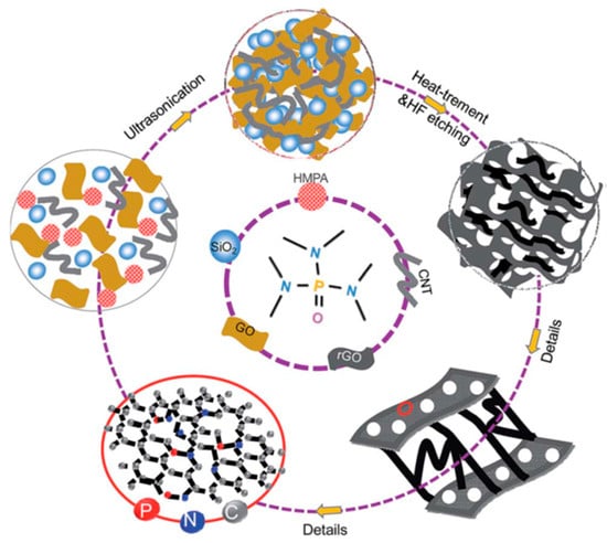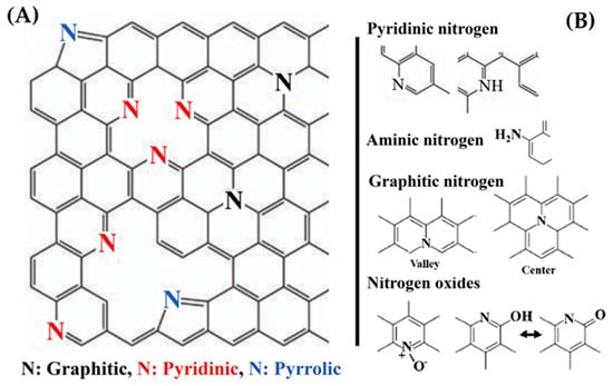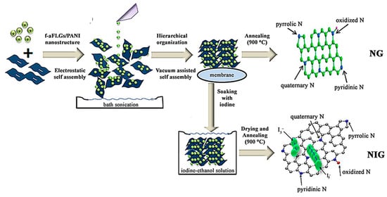 In 2010, Long et al. [121] prepared nitrogen-doped graphene sheets through hydrothermal reduction of colloidal dispersions of graphite oxide in the presence of hydrazine and ammonia at a pH of 10 via multiple reactions such as ring opening of epoxides induced by hydrazine as well as reorganization of the carbon skeleton with incorporation of nitrogen (Figure 9).