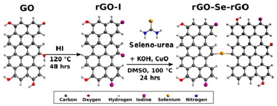 The hydrothermal technique has been largely used in the reduction of graphene oxide because it offers the advantages of being a water-soluble reaction, and the ionic product of water is high. Under hydrothermal conditions, the protonation of ·OH functionalities originates dehydration on the edges or basal planes of GO, followed by the π-bonding restoration [113,114,115,116,117,118,119,120].