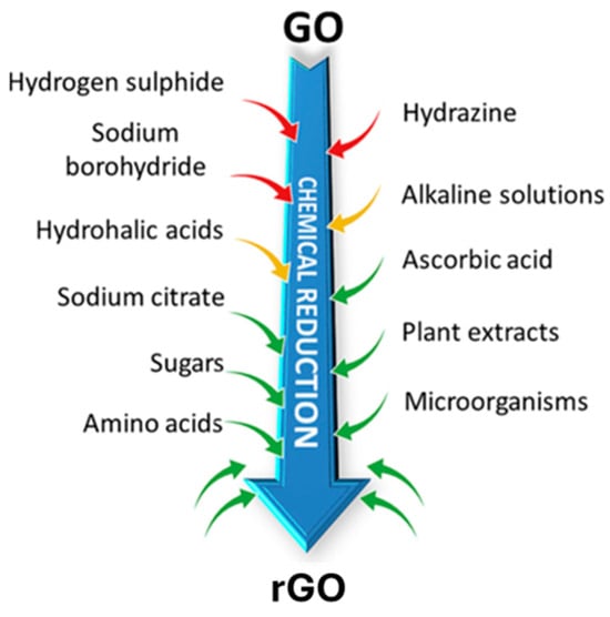However, to reduce toxic chemicals and complicated manufacturing procedures, researchers introduced green reduction agents comprehending sugars (saccharides) [96,97,98], ascorbic acid (Vitamin C) [96,97,98,99,100], and micro-organisms such as bacteria [101,102], as well as amino acids [103,104,105,106] and plant extracts [107,108,109,110]; ascorbic acid, in particular, has produced rGO with electrical conductivity up to 800 Sm−1, which is almost comparable to that of rGO prepared using hydrazine [111].