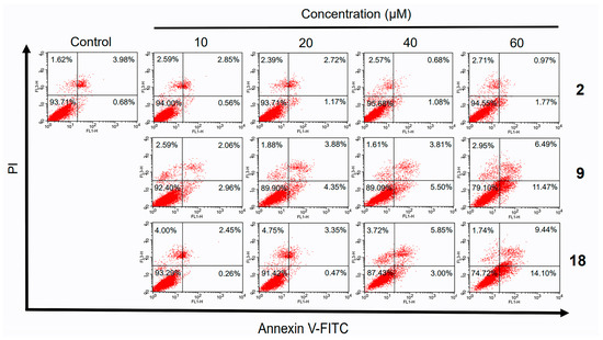 Flow cytometry analysis of HepG2 cells treated with different concentrations of norcantharidin (2), compounds 9 and 18 for 48 h. Treated cells were examined for apoptotic cells using Annexin V-FITC apoptosis detection kit. Annexin V-positive/PI-negative cells were in early stages of apoptosis and double-positive cells were in late stages of apoptosis, whereas annexin V-negative/PI-positive cells were necrotic.