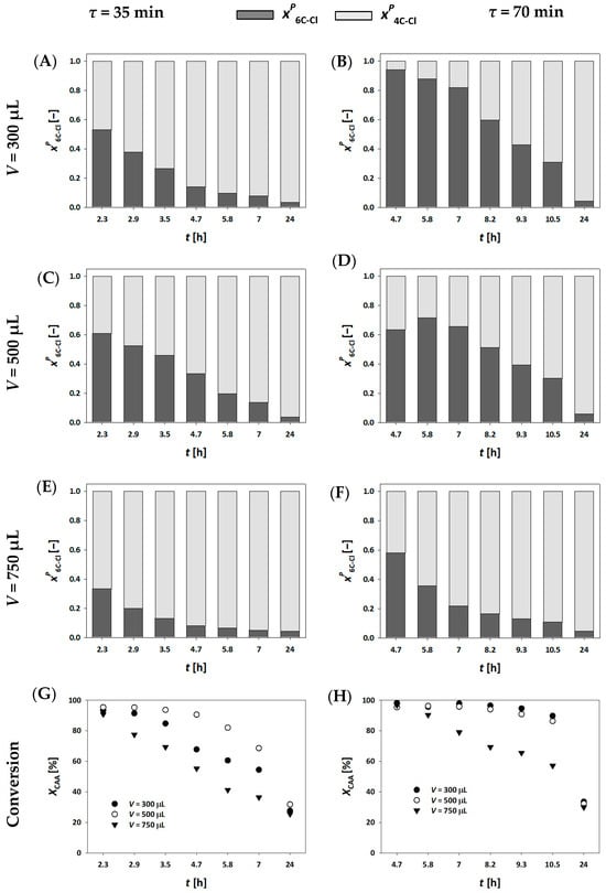 The DERA024 enzyme immobilized on mesoporous silica [34] was applied in fixed bed millireactors, a setup that has been demonstrated for DERA enzyme in previous studies [19,33,38]. Three different millireactor volumes were used to investigate the effect of characteristic millireactor dimensions (length, width and depth) on key process indicators. Flow rates were adjusted so that residence times of 35 and 70 min were the same for all tested millireactors, while initial substrate concentrations remained the same. Samples were collected at the reactor outlet during each experiment and analyzed using the Bradford assay to monitor potential enzyme leaching. No detectable enzyme loss was observed throughout the experiments. Figure 2A–F present the molar fractions of the single and double aldol adducts, while Figure 2G,H display conversion data for all three millireactor volumes at different residence times.
