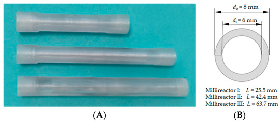 (A) Three-dimensionally printed tubular millireactors with volumes of 300, 500 and 750 μL and (B) characteristics of the millireactors.