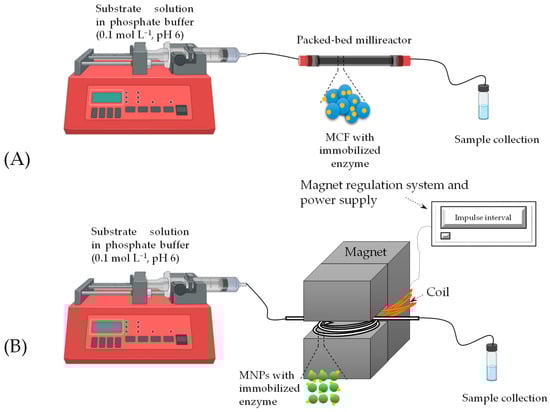 Immobilization of the enzyme not only contributes to increased stability but also facilitates its application in flow processes. In this study, we investigated the performance of these optimized immobilized enzymes in continuous flow millisystems. We selected millireactor systems with volumes under 1 mL, because such systems offer numerous advantages, including improved mass and heat transfer, better control of process parameters (such as temperature and flow rate), and straightforward production increase, by increasing the number of reactors (numbering up) instead of increasing the reactor volume [37].