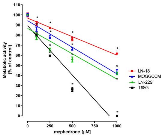 Influence of mephedrone on the metabolic activity of selected human glioblastoma and astrocytoma cell lines. Cells were exposed to culture medium alone (control) or culture medium containing mephedrone (100–1000 µM). Cell metabolic activity was examined after 96 h of cell treatment by means of MTT assay. Data are presented as mean ± SEM of 6 independent trials and were analyzed by means of linear regression, * p < 0.05 vs. control; one-way ANOVA test; post hoc test: Dunnett’s.
