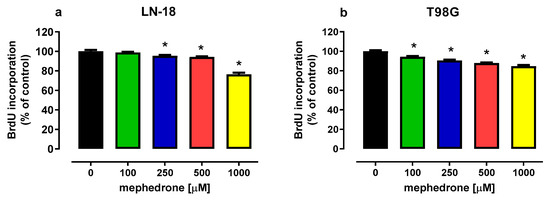 Influence of mephedrone on the proliferation of human glioblastoma LN-18 cells (a) and human glioblastoma multiforme T98G cells (b). Cells were exposed to culture medium alone (control) or culture medium containing mephedrone at concentrations ranging from 100 to 1000 μM for 48 h. Cell proliferation was measured photometrically by means of the BrdU assay. Results are presented as the mean ± SEM of 6 independent trials, * p < 0.05 vs. control; one-way ANOVA test; post hoc test: Dunnett’s.