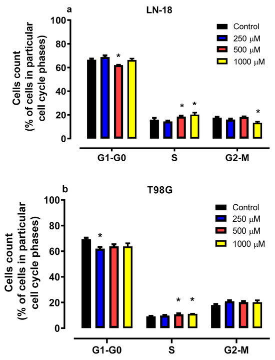 As presented in Figure 3b, 48 h of T98G cell incubation with mephedrone revealed significant changes in both the G0/G1 and S phases. Mephedrone at a concentration of 250 µM decreased the cell number in the G0/G1 phase to 62.03%, compared to 69.42% in the untreated cells. At the same time, treatment with mephedrone led to a significant S-phase arrest. The number of cells in the S phase increased up to 10.81% (500 µM) and 11.10% (1000 µM) compared to the control (9.15%).