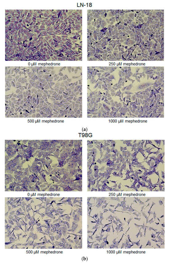 Microscopic analysis of LN-18 and T98G cells treated with mephedrone confirmed the antiproliferative properties of the investigated compound, as evidenced by a dose-dependent reduction in the number of human glioblastoma cells (Figure 4). The exposure of cells to mephedrone revealed changes in their intracellular pH homeostasis, since the nuclei of LN-18 cells turned from pink to light blue, while the color of the nuclei in T98G cells changed from light blue to celadon, indicating acidification.