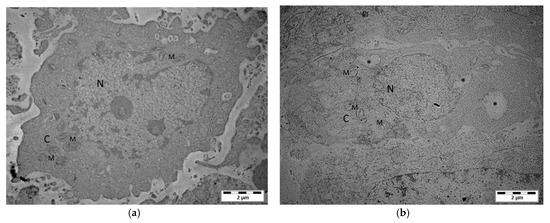 Electron microscopic evidence for the vacuolization of the human glioblastoma multiforme cell line LN-18 exposed to mephedrone. Untreated control cells (a) and LN-18 cells after 24 h incubation with mephedrone (1000 µM) (b). N—nucleus; C—cytoplasm; M—mitochondria. * Enlarged vacuoles. Magnification: 8000×.