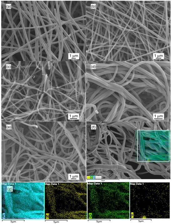 SEM images of electrospun carbon nanofibrous electrode materials: (a) ECNF; (b) F-ECNF; (c) ECNF-F; (d) ECNA; (e) ECNA-F; (f) ECNA-F for EDX mapping; and (g) respective C, N, O, F EDX mapping of ECNA-F.
