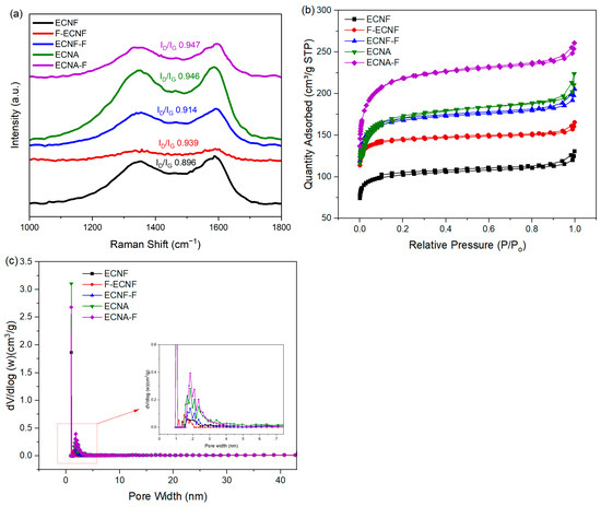 Raman spectra (a), N2 adsorption–desorption isotherms (b), and pore size distribution (c) of ECNF, F-ECNF, ECNF-F, ENCA, and ENCA-F nanofibrous electrode materials.